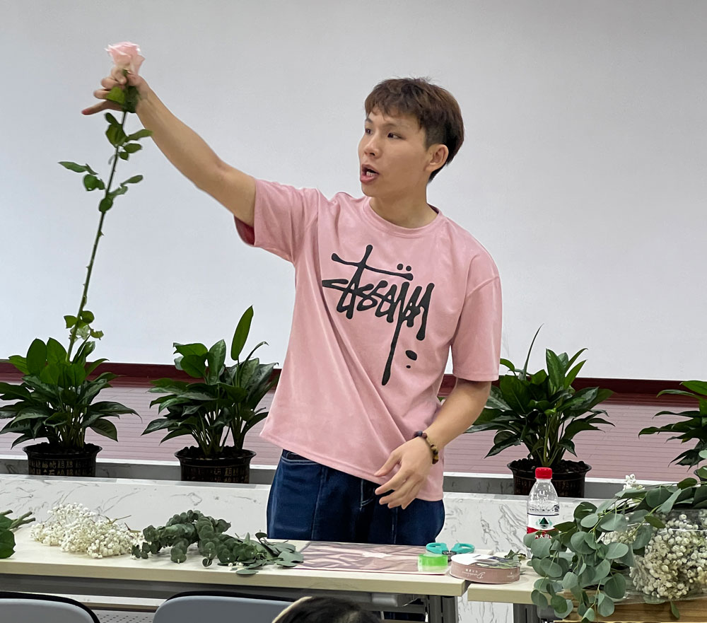 在老師的悉心指導(dǎo)下,大家大膽發(fā)揮自己的想象力,通過自己靈巧的雙手,將經(jīng)過修剪的多種花材,根據(jù)不同的色彩、形狀,有層次地搭配在一起。