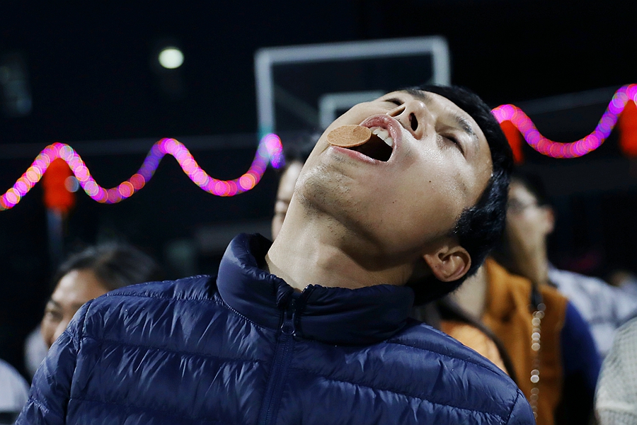 第二個游戲環(huán)節(jié)是“擠眉弄眼”。這個游戲的規(guī)則是頭朝上,額頭放置山楂片一塊,然后選手運用自己的臉部的五官靠肌肉扭動把山楂片從額頭移到嘴里,是一個既好玩又好吃的游戲,最后由風(fēng)控中心/管理中心/市場中心組成的群英隊獲得了“擠眉弄眼”的冠軍。